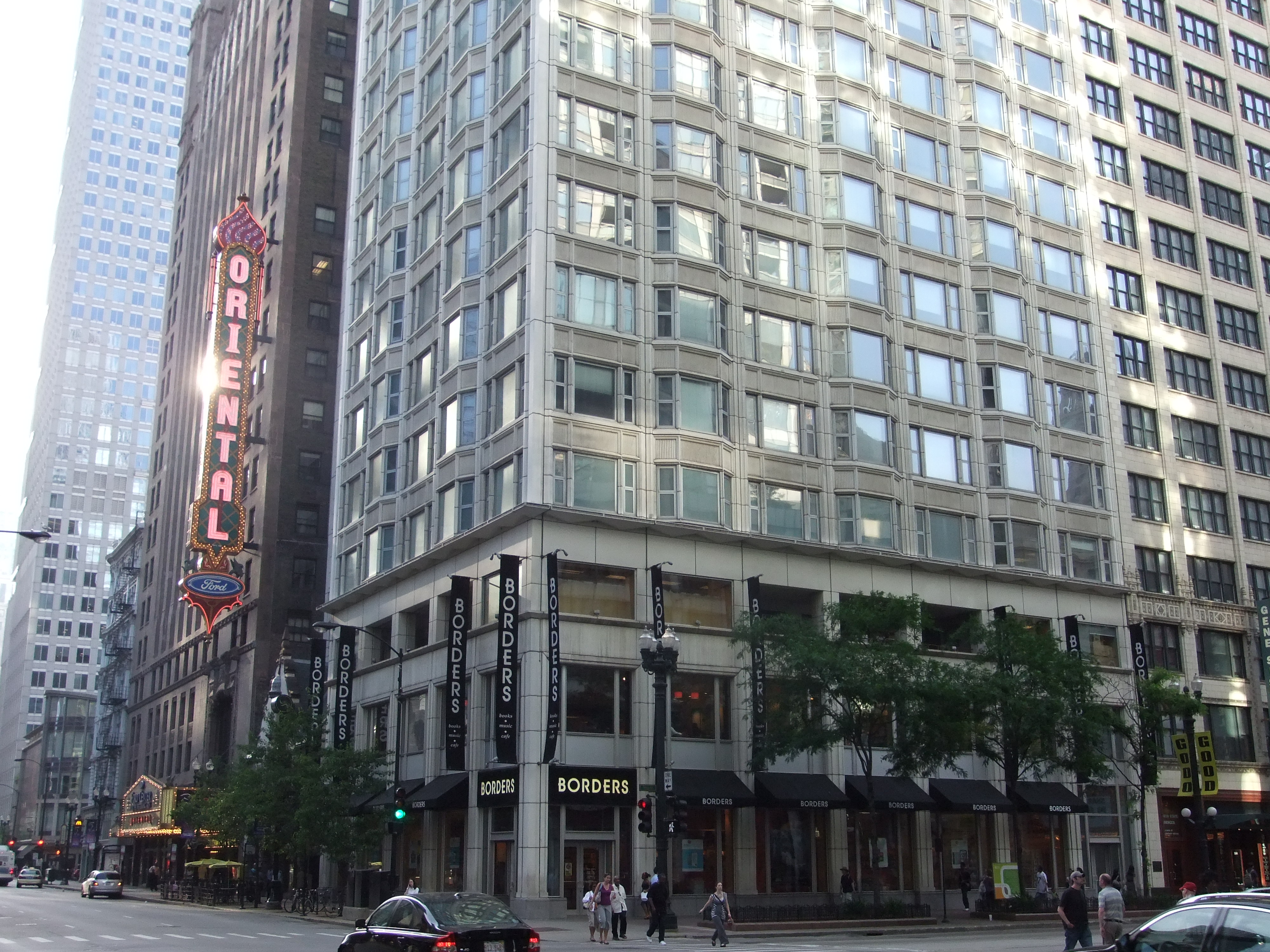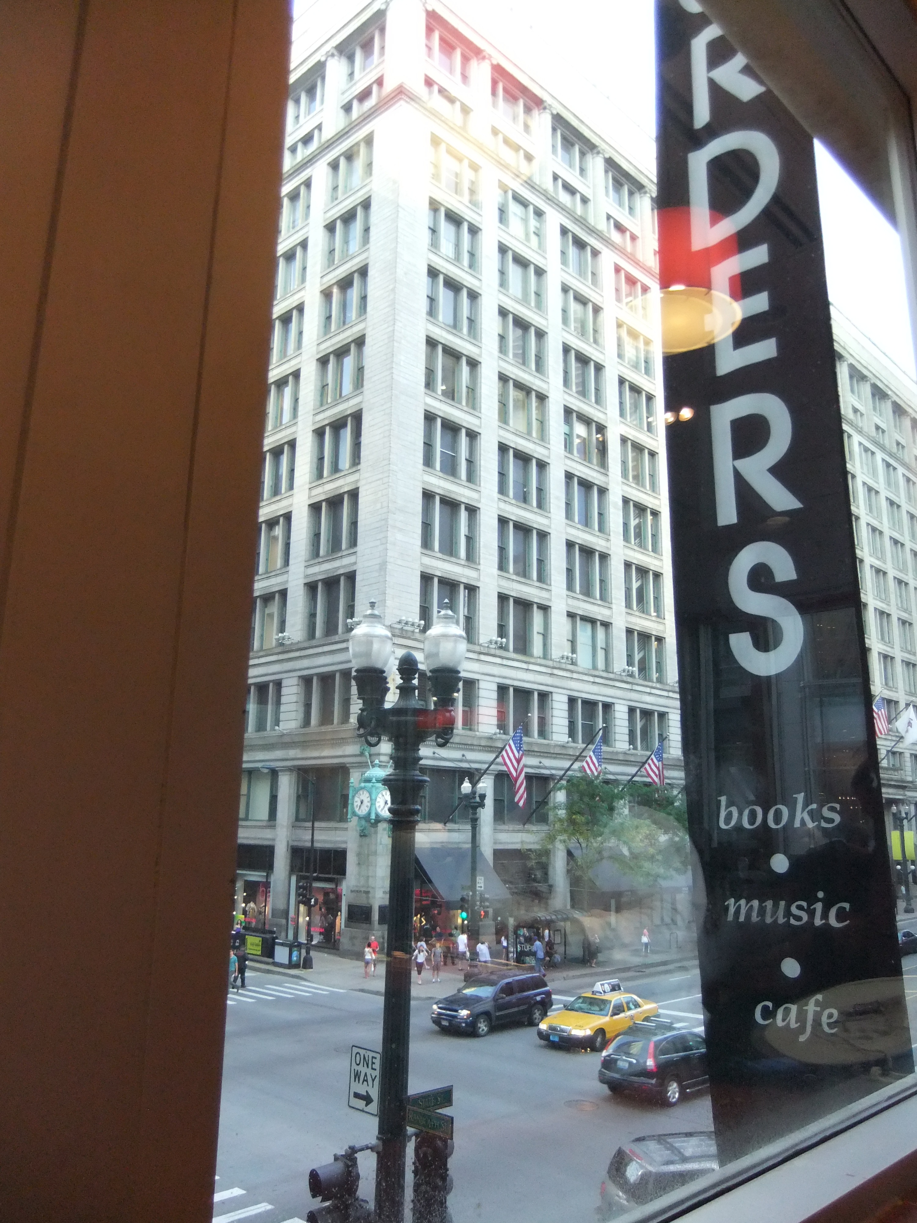 On Tuesday I’d taken my camera. Now I’m super happy I did. Here are my last pictures of the Borders on State that was. The first is what I see when I walk west on Randolph to get there. I imagine tomorrow there will be huge posters in the window announcing their liquidation sales. I’ve seen them when the Borders closed on Michigan Avenue across from Water Tower Place. Sad. The end of an era.