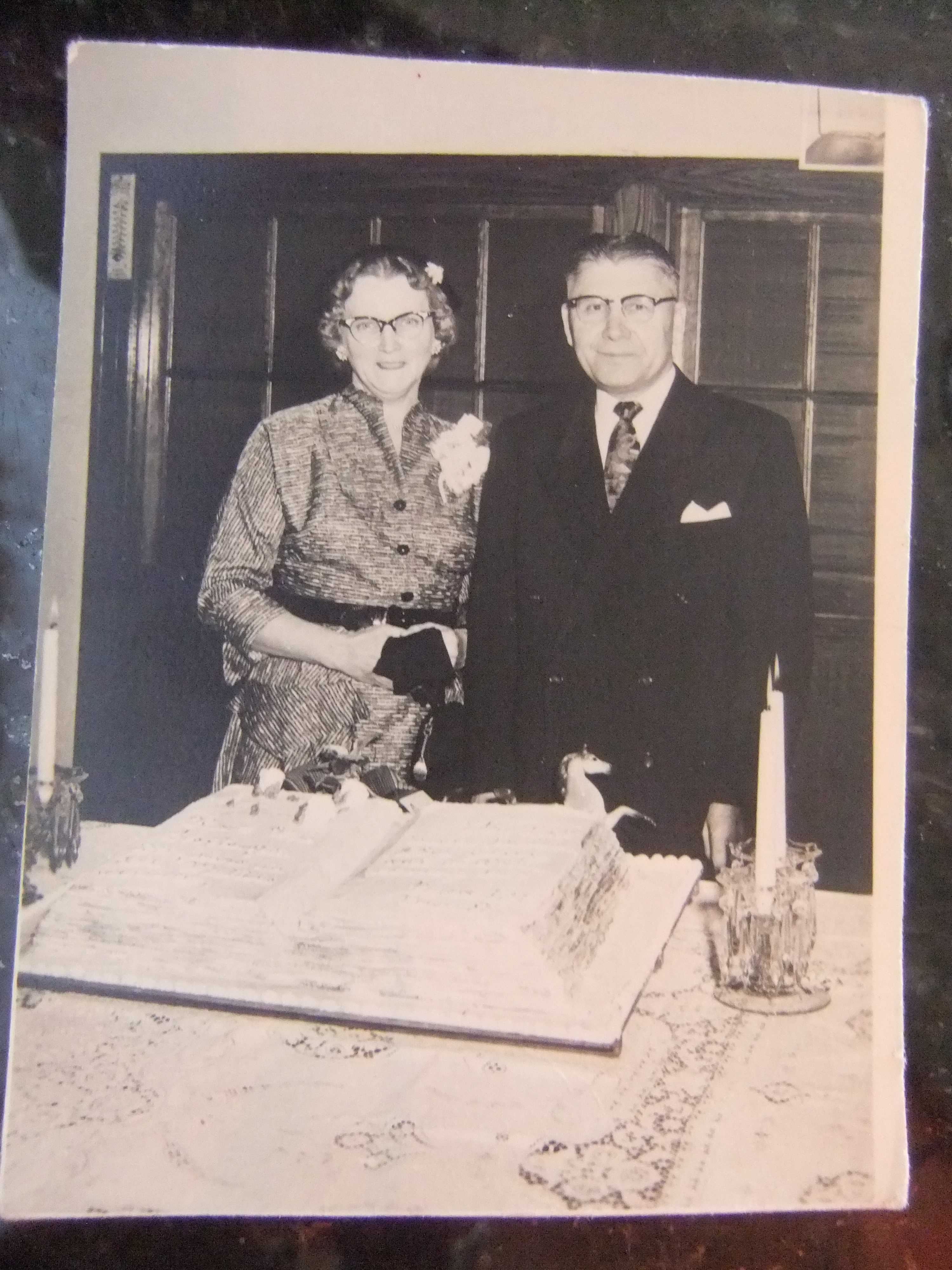 I remembered my folks’ twenty-fifth wedding anniversary celebration in the church basement. My mother’s black and white tiny striped dress made of fabric that crinkled like newspaper. The glass windows behind them that raised so the kitchen on the other side could use the counter to serve. The ’54 Plymouth, light blue on the bottom and black vinyl on top, they received as a present from the congregation.