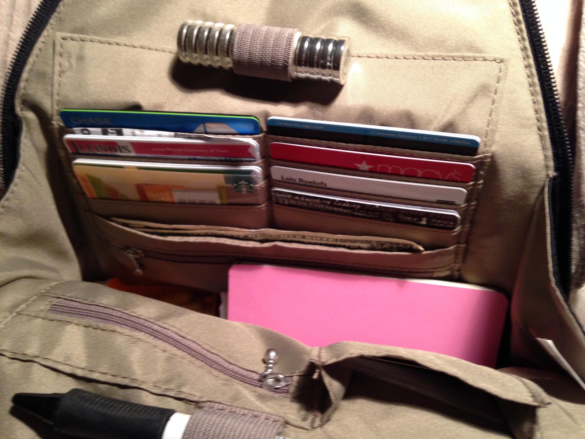 The purse, you see, has every compartment a women needs. A band for lipstick, a band for a pen, many slots for credit cards (I haven’t carried a bulky billfold in years), room for a paperback or e-reader, two zippers inside for change or whatever, and two zippers on the outside, one in front and one in back under the straps. I can wear it like a backpack, or zip up the straps and sling it over a shoulder, or carry it with a small rounded loop at the top. Talk about versatile!
