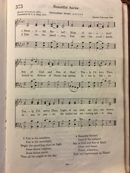 “Room 373,” the hotel clerk said. I sighed with relief. I’d been staying at numerous hotels in the past year and trying to remember room numbers had become a nuisance. But 373 instantly registered as the number of the hymn, Beautiful Savior, in the red Psalter Hymnal of the church of my childhood. The hymn had three flats, the most advanced I could ever play when taking piano lessons, so I would play the hymn during practice time.