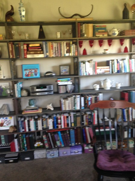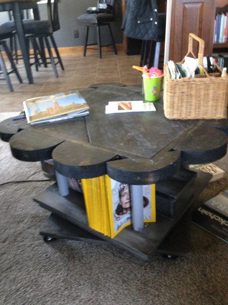 The rotating end table has a fun story. I’d told him I wanted a table that turned so I could, from my position on the couch, just turn it a little to reach my next stack of books. One day he saw a round, chest-height, display table in Staple’s garbage (Staples shared a loading dock with our downtown condo). He proudly rolled it home down the street, took it somewhere near his office to saw down the metal pole legs, and built a new creative top. Bingo–a rotating end table.
