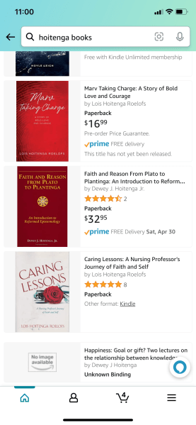 Now it’s 2022. I am 80. My husband has passed away. Lung cancer, 2018. I’ve written a book about our experience. Curious, I searched my maiden name, Hoitenga, on Amazon Books. And there was my brother, one of his books–Faith and Reason From Plato to Plantinga: An Introduction to Reformed Epistomology--sandwiched between my nursing book and my cancer book. Another of his books peaked from below on my screen shot.