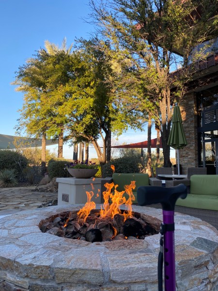 My favorite hangout spot in AZ–the fire pit at our club. A great place to meet people. Note my cane, still a must for walking outside.
