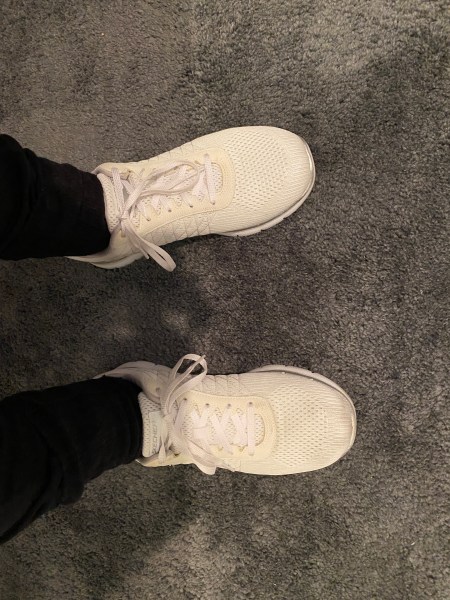 I get dressed. Clothes draped over a chair from yesterday will work. Leggings, sweatshirt, socks. I’m not going out, so shall I wear slippers or shoes? I scan my three-shelf, white bookcase that serves as a shoe rack. I spot my sister Esther’s shoes. The ones she was going to wear on her first visit to me in SD. She didn’t make it. She died six years ago last week. Cancer. Complications after surgery.