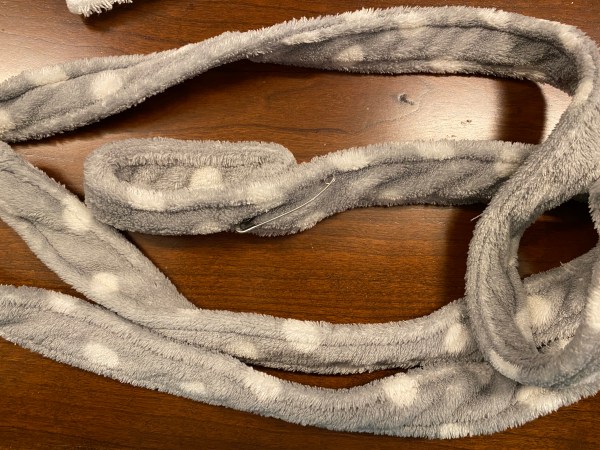 So I go to my closet. It’s also a good day to do a washing. I see in the pile an older robe I’d thought I may donate. I have a new one–a soft blue. But back to this one, the old gray one with white polka dots. I start to pull the belt out of the loops. A belt loop stops a loop in the belt