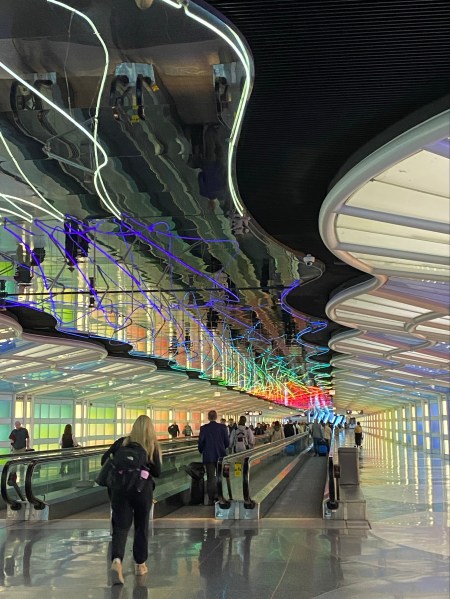 When we lived downtown Chicago, we’d take the pedway under our building to catch the Blue Line (el) to O’Hare. We often traveled United so we’d first encounter the psychedelic moving walkway above. I’d take the walkway and Marv would walk alongside and reach the end the same time as I did.
